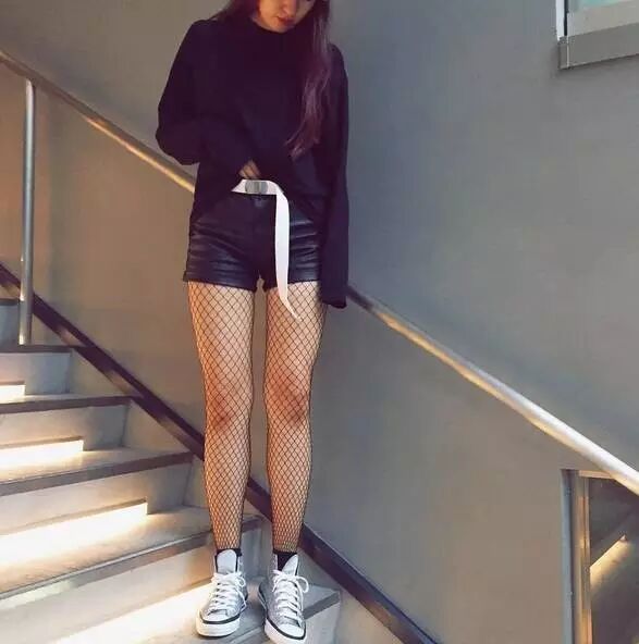 因为短裤+渔网袜+运动鞋实在让人觉得有点作妖(直男恐怕要跳楼了~)