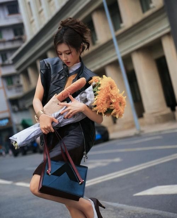 深色工装马甲,利落短发,手里不是什么精致的名牌手袋,而是一根长长的、看起来硬邦邦的法棍。