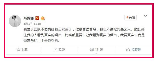 尚雯婕以为是团队买的水军,于是,就有了微博上“不要再买水军”的flag。