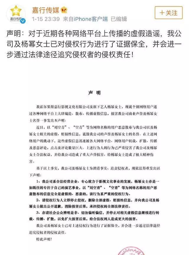 可惜文章没迎来大结局,却等来了杨幂工作室的严正声明。工作室周一深夜紧急发声,直接点名“刘空青”,散布与杨幂女士有关的虚假、贬损性信息,要求刘空青立即停止侵权,并公开对杨幂进行道歉,否则会承担相应的法律责任。