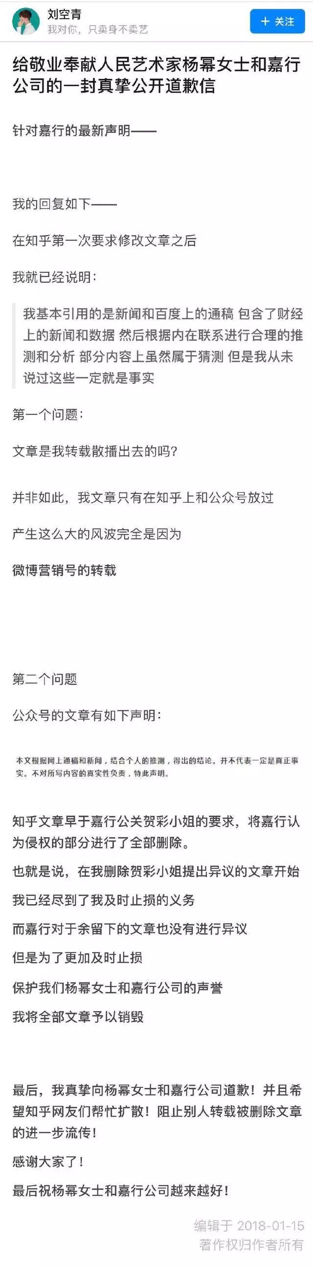 在杨幂工作室发出声明后,没想到刘空青一秒怂了,不仅马上删除了知乎上所有相关文章,还连夜写了道歉信。