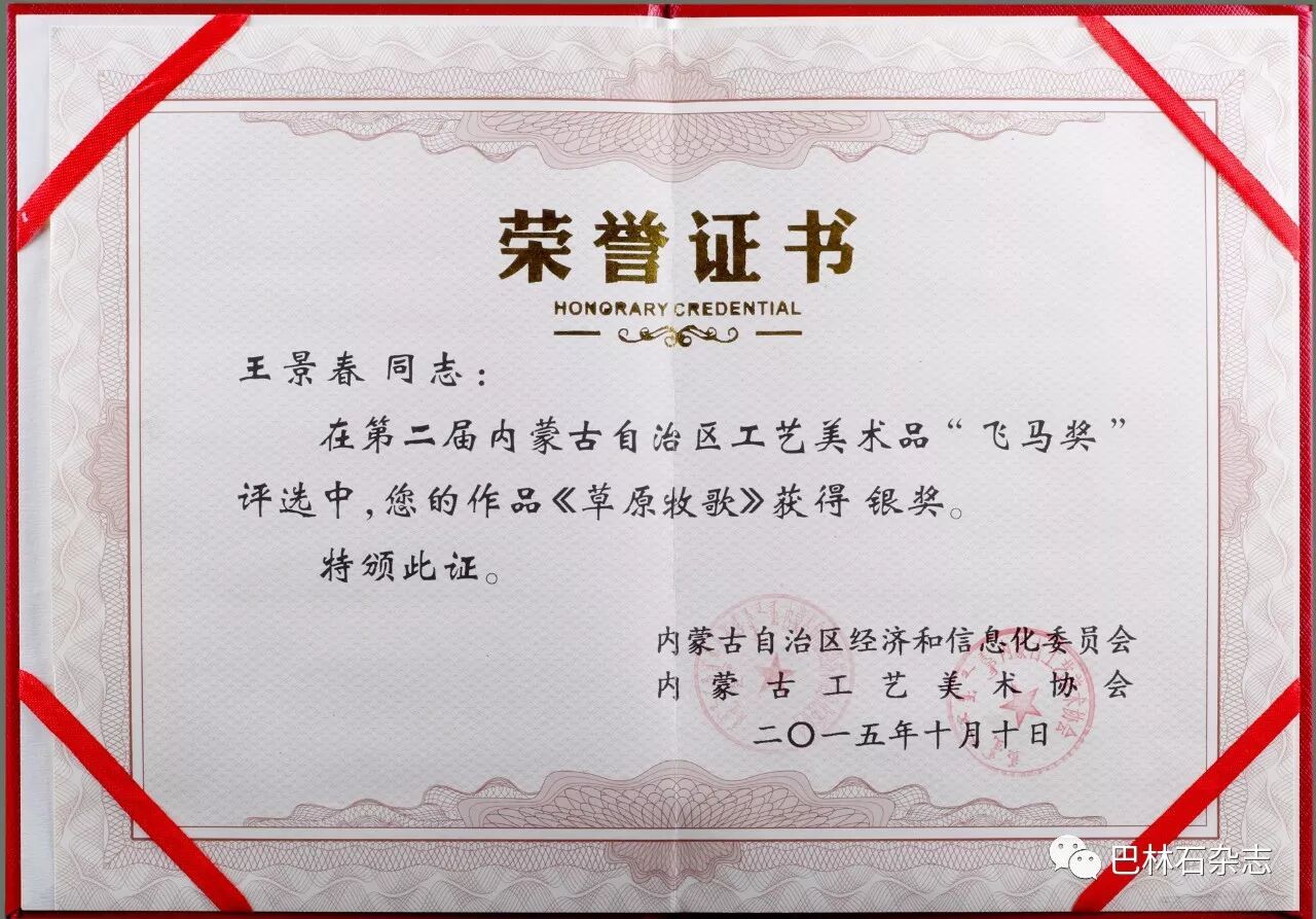 功夫不负有心人,辛勤的耕耘终结硕果,2013年在北京轻工业协会举办的中国传统工艺精品展中,凭借作品《花好月圆》获得“巧夺天工”金奖,《金玉满堂》获得银奖。2815年十月份参加了内蒙古自治区工艺美术品“飞马奖”的评选,作品《草原牧歌》获得银奖,并获得评委会高度好评!用王景春先生的话说,《草原牧歌》是以中国山水画为积淀,以蒙古风情为主题,在继承传统