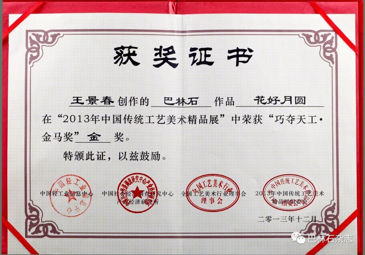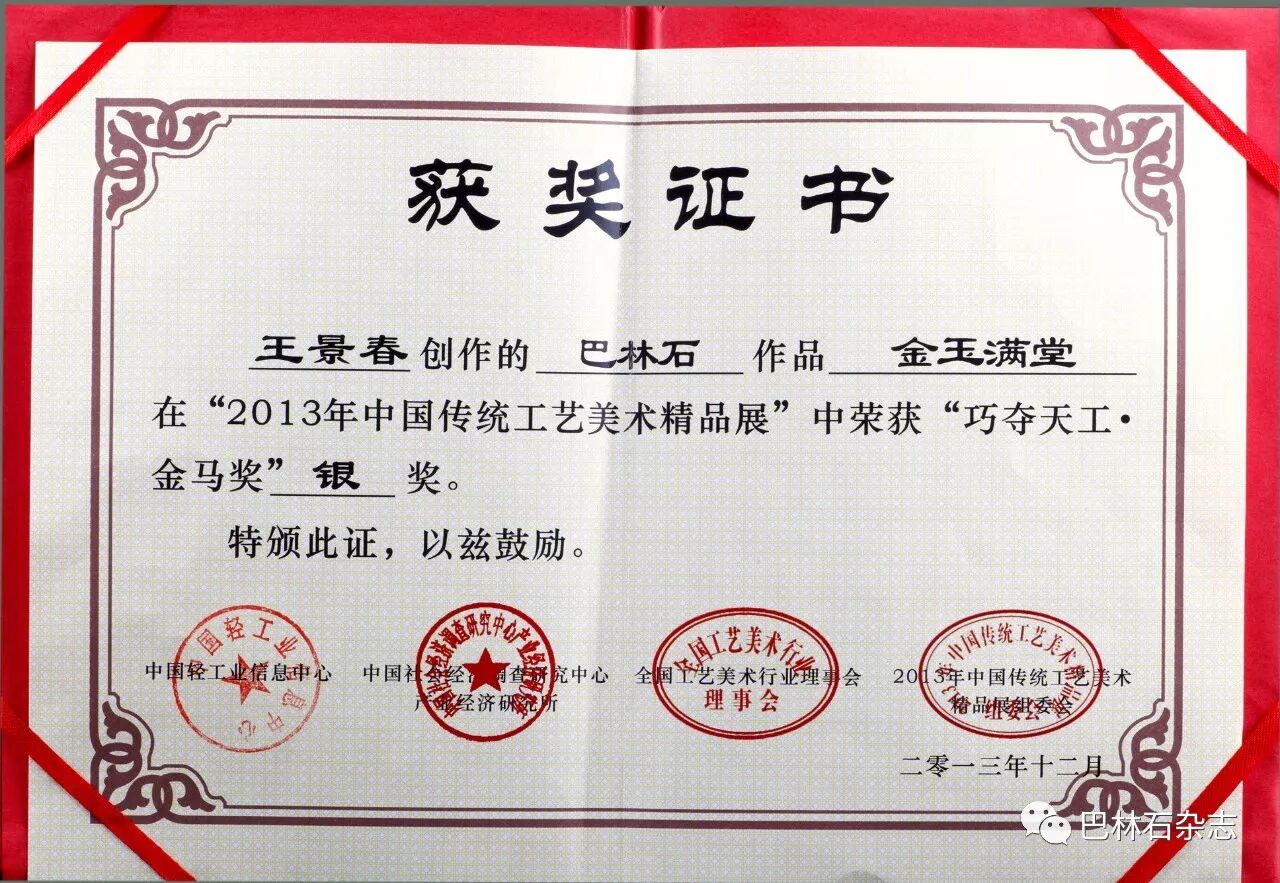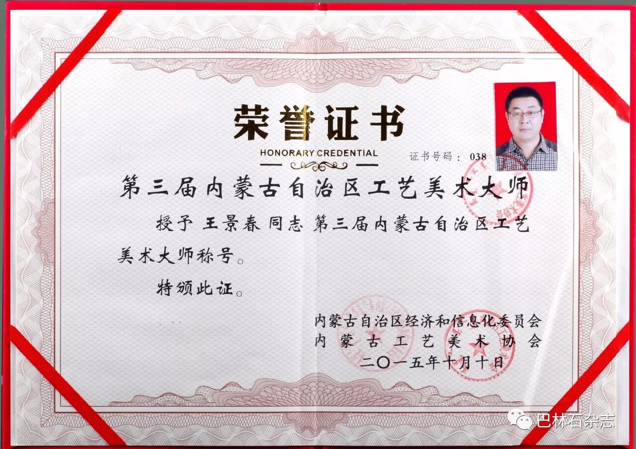 在王景春先生的眼里,作品获得的奖项并不代表着雕刻水平的高低,荣誉只是对他多年来在巴林石雕刻领域里潜心探索的一种肯定。巴林石本身就是一种文化,他想通过自己的刻刀,用自己的美术功底等形式来表达对家乡的热