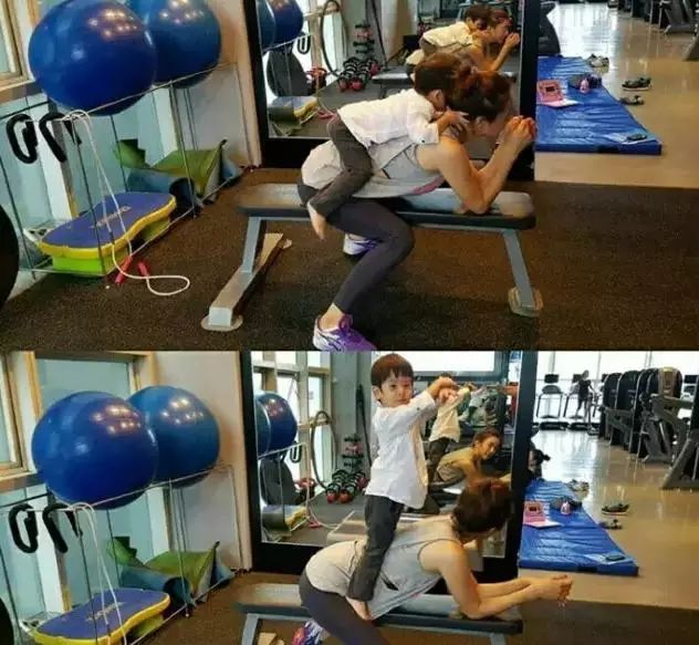 好厉害的麻麻,就这么驮着儿子健身