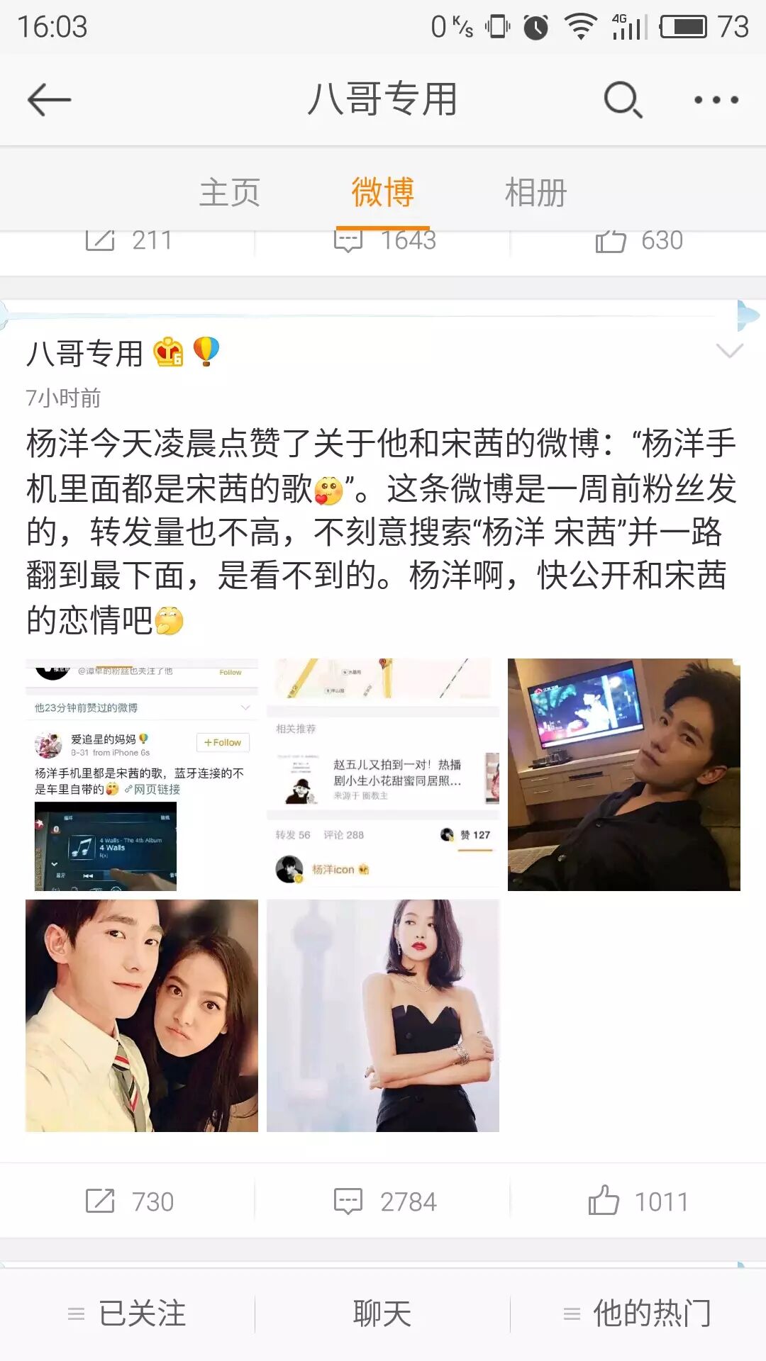 今晨,微博id为“八哥专用”的博主,整理发布了一组杨洋和宋茜疑似有情的消息,内容大致为:杨洋点赞了一条关于他和宋茜的微博。