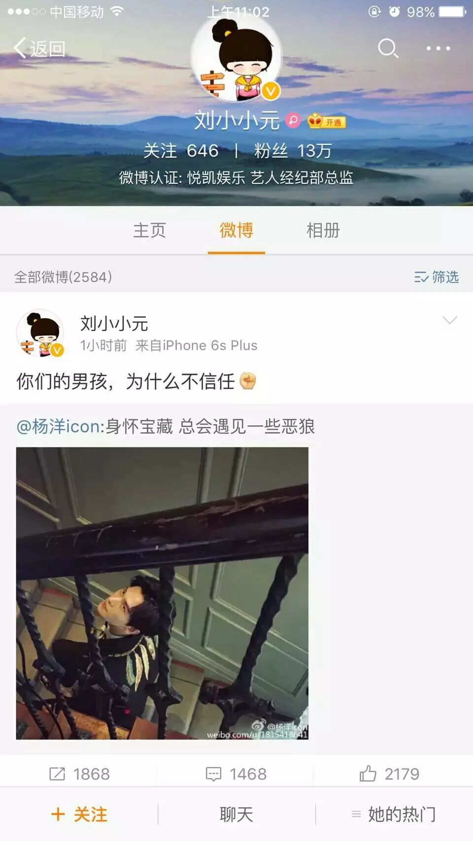 对的,就是这个转发杨洋“恶狼”微博,称要相信“你们的男孩”的刘小小元