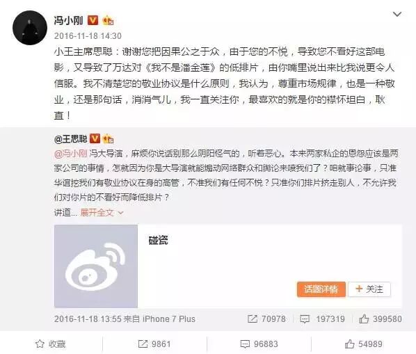 去年11月,因为《我不是潘金莲》在万达院线排片少,冯小刚和王思聪在微博上“怼”了起来。为什么冯小刚如此在意排片量?原来,冯小刚与华谊兄弟签了业绩对赌协议,完不成业绩,就要自己掏腰包。