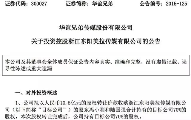 2015年11月19日,冯小刚的公司东阳美拉在与华谊兄弟签署了股权转让协议,当时冯小刚持有东阳美拉99%股权,陆国强持有1%。华谊兄弟一次性支付了10.5亿元收购了东阳美拉70%的股权,其中包括冯小刚69%的股权,陆国强1%的股权,冯小刚套现10.35亿元。要知道,冯小刚光靠拍电影赚钱可没那么快,从1997年至2008年他拍了《甲方乙方》《手机》《天下无贼》《夜宴》《非诚勿扰》等9部商业片,总票房才过10亿元。