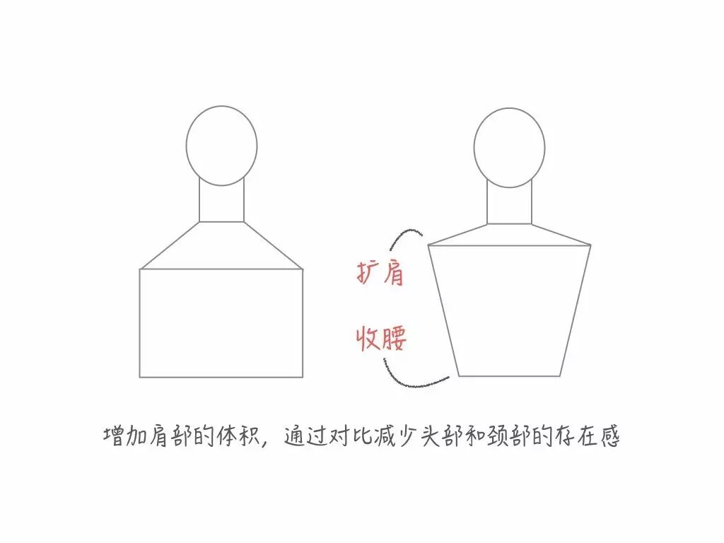 这种衣服呢,其实就是给你造出一个更加具有体量感的肩膀出来,肩膀强壮了,自然就可以反衬得脑袋和脖子小一点了。口说无凭,看我下午用keynote画出来的示意图,右边是不是协调很多?你们可以用尺子量,绝对没有偷摸着把右边的头和脖子缩小~