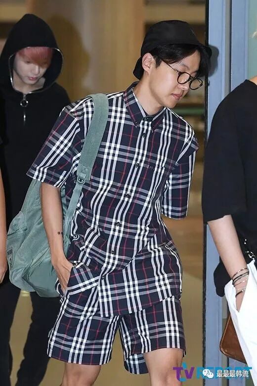 郑号锡的这身机场look选了有点像睡衣的格子套装,本来我个人不是很喜欢套装的穿搭模式,但是放到机场真的让人挪不开眼睛诶!