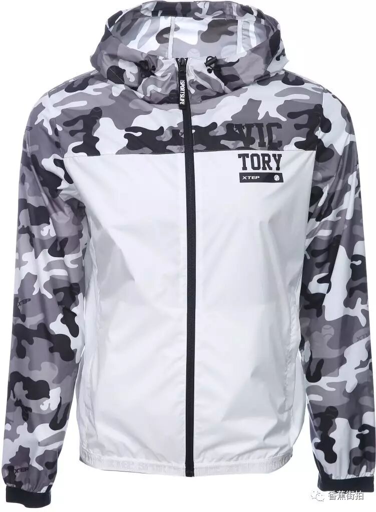 迷彩防风衣、T恤、长裤、运动鞋:特步XTEP