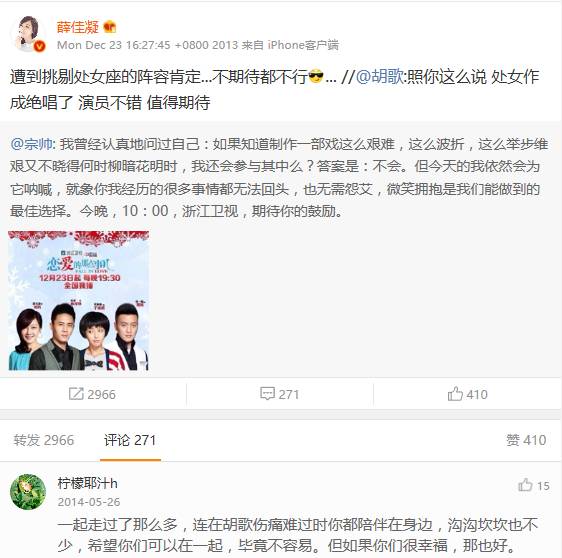 薛佳凝对于胡歌是特别的,他们一起经历过一夜成名的幸运,也走过命悬一线的危难。想当初,薛佳凝刚开始用微博时,关注的第一个人就是胡歌。