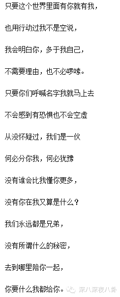 这哪是简单的主题曲,明明是一封深情洋溢的给兄弟的信嘛。从这两人的表现里,感觉beyond乐队复合还真是有可能。