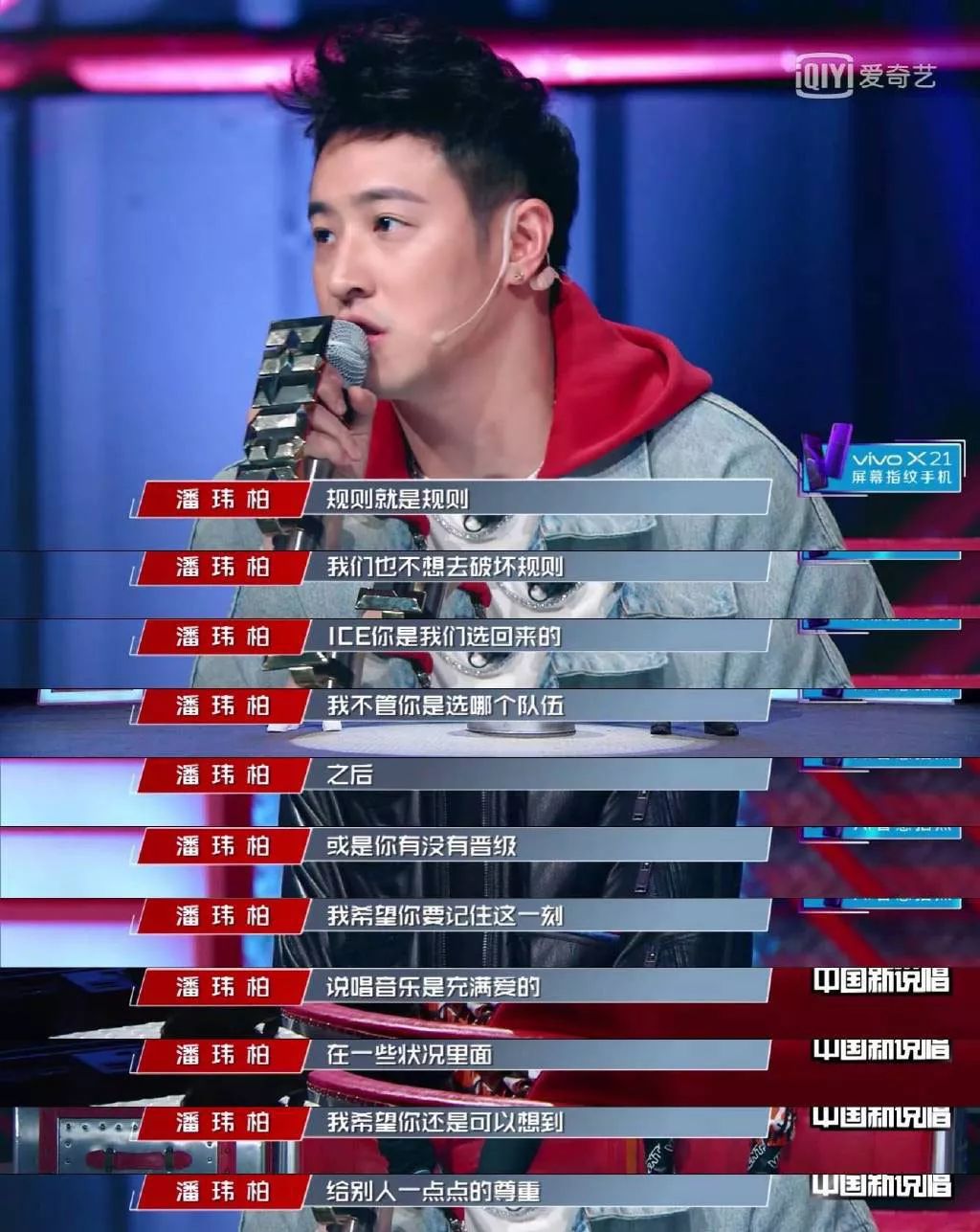 对于ICE无视peace & love的嘻哈精神,一切只为晋级的行为,潘玮柏就险些发飙,对他做出了严厉批评,强调尊重、善意也应该是嘻哈文化的重要内核,就算胜负心在燃烧,也不能把对竞争者的起码尊重完全烧毁。