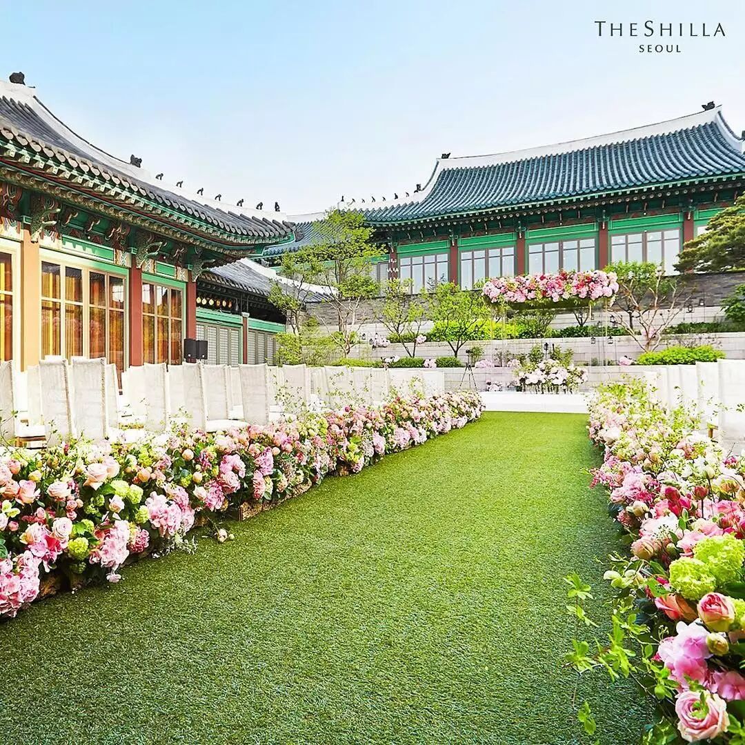 双宋选择在新罗酒店结婚,另一大原因是这里的宴会厅实在太耀眼了!酒店保留下来的传统迎宾馆最具特色!迎宾馆是按照韩屋风格设计的二层楼建筑,重现了15世纪以前新罗王朝雍容华贵的皇家风范。夜晚的时候,灯光还会勾勒出美丽的边缘美丽的线条。