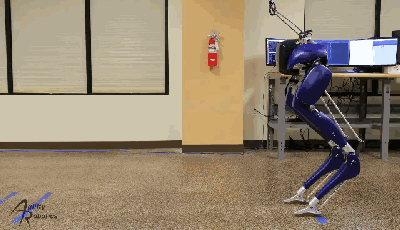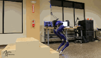 可以看出,Cassie在上第二阶踏空时有一个明显的向上踮脚的动作,但这不存在的一节阶梯并未对它的平衡性产生影响,Cassie依然保持了稳定。如果此处替换成蒙眼的人类,在第二阶踩空的时候很有可能已经摔倒了。所以从某种意义上来说,Cassie的动态稳定性还是要比人类好了许多的。