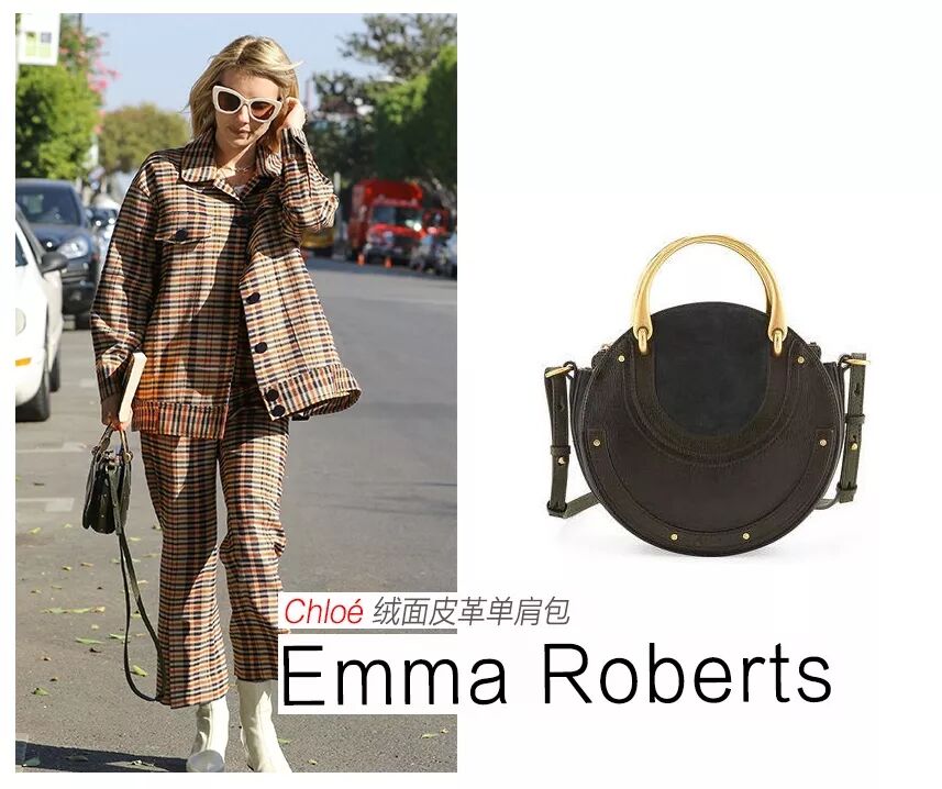 哈比星人穿搭教科书的Emma Roberts这身格纹套装玩得很巧妙,白色猫眼墨镜与白色皮靴相呼应,罗女士在我们心里就是1米8。