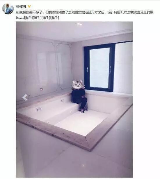 1月29日,郭敬明晒出了自己在豪宅内的一张照片,并且说新家装修的差不多了。郭敬明晒出的是自己新家的浴缸,而这个浴缸面积大的有些夸张,以至于有网友称这不是浴缸,应该是浴池了。