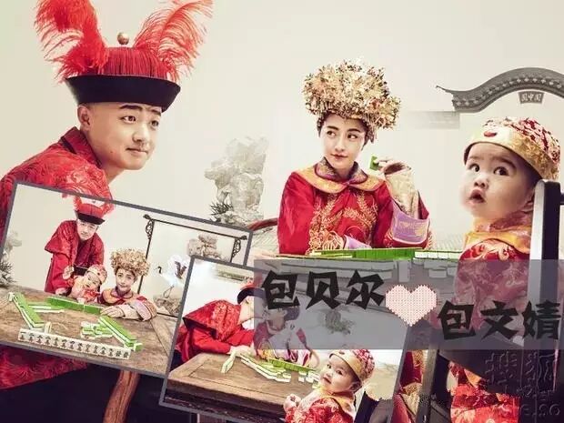 包贝尔、包文婧携女儿饺子拍摄了一组颇有传统风味又搞怪的婚纱照。不满1岁的饺子,跟着爸爸妈妈坐在麻将桌前玩起了国粹,包贝尔、包文婧两人在镜头前狂秀恩爱,饺子可爱爆棚,一家三口其乐融融。