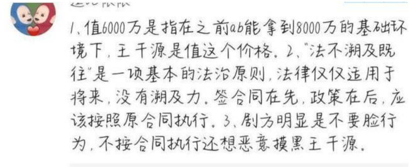 剧组不准从契约精神,甚至还发文,利用舆论打压,也不能怪王千源索要全部片酬了,至于他值不值这个价就得另说,毕竟白纸黑字在那放着。