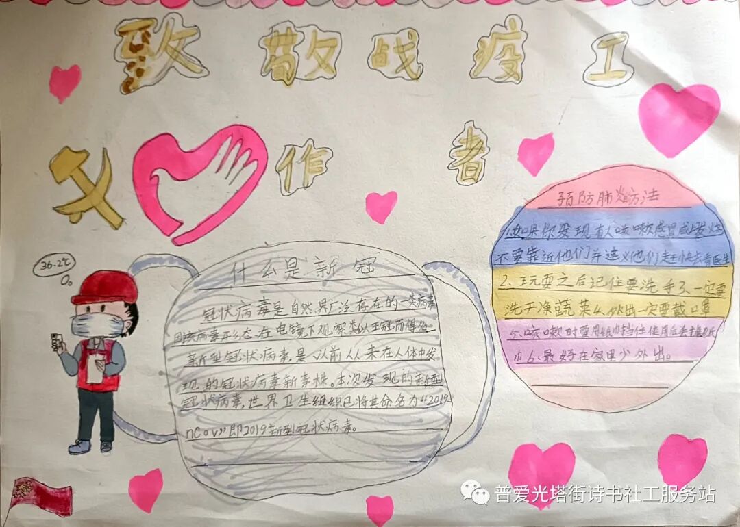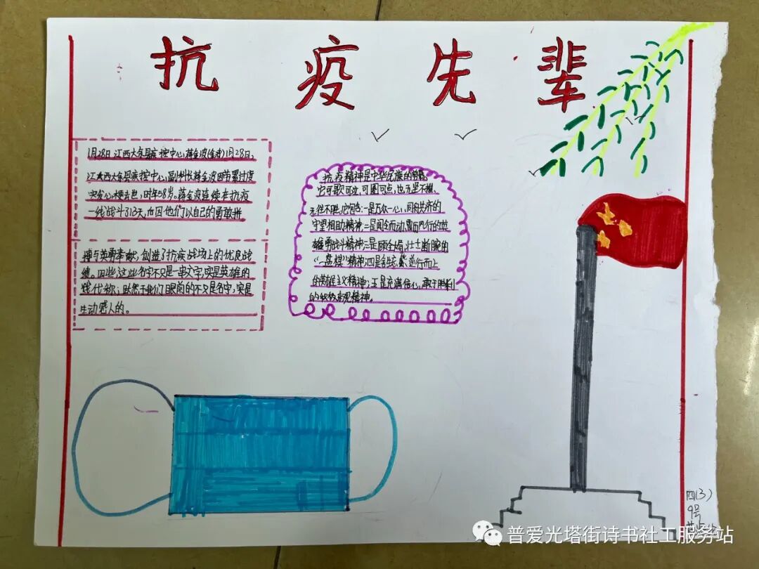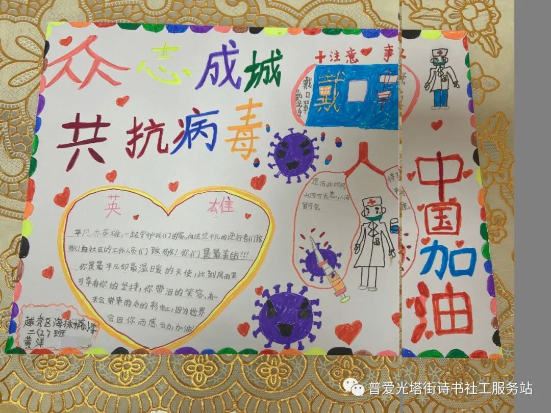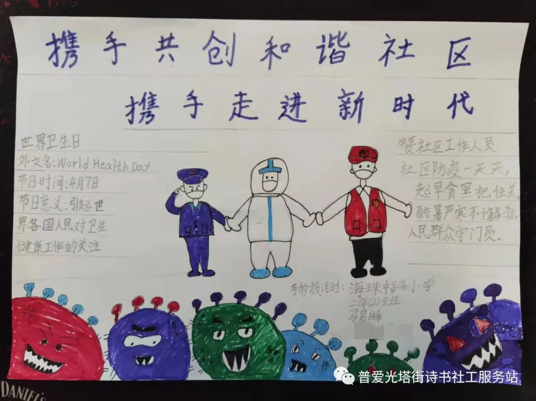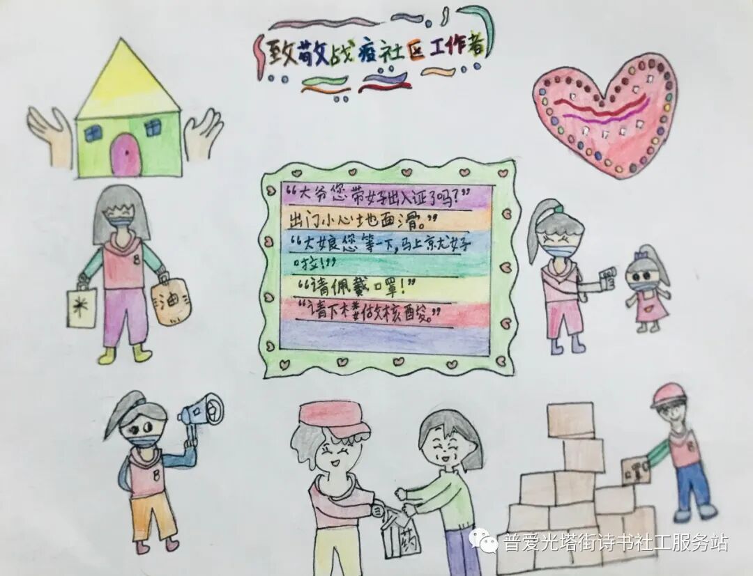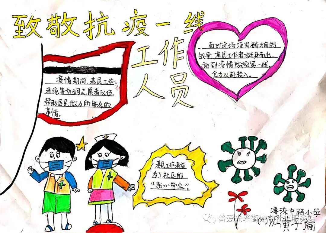 为向处在疫情防控一线的社区工作者表达敬意,广州市光塔街诗书社工站服务站举行致敬战“疫”社区工作者·手抄报征集活动。同学们通过制作手抄报的形式,向处在疫情防控一线的社区工作者表达崇高的敬意。