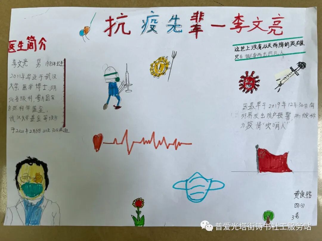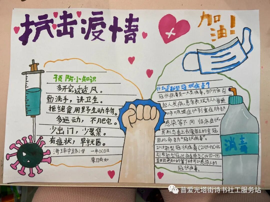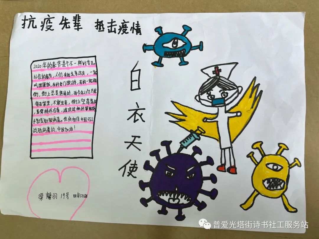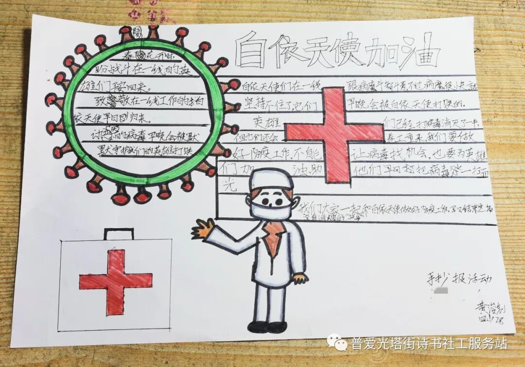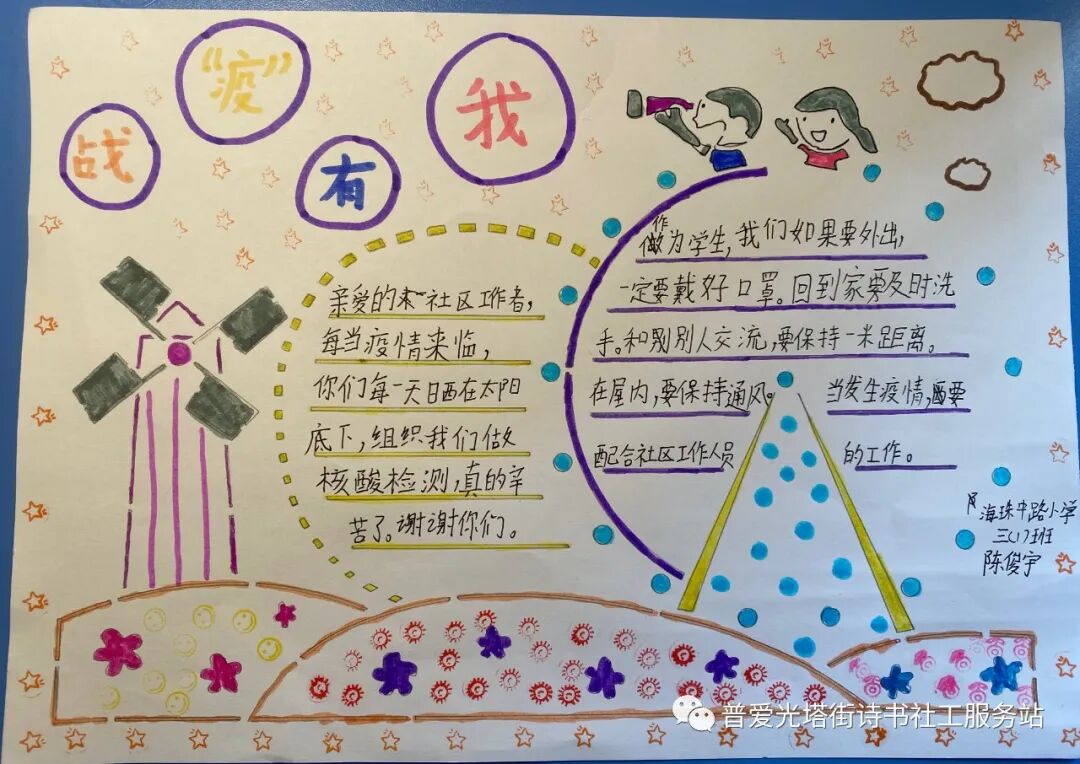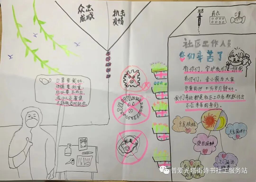 为向处在疫情防控一线的社区工作者表达敬意,广州市光塔街诗书社工站服务站举行致敬战“疫”社区工作者·手抄报征集活动。同学们通过制作手抄报的形式,向处在疫情防控一线的社区工作者表达崇高的敬意。