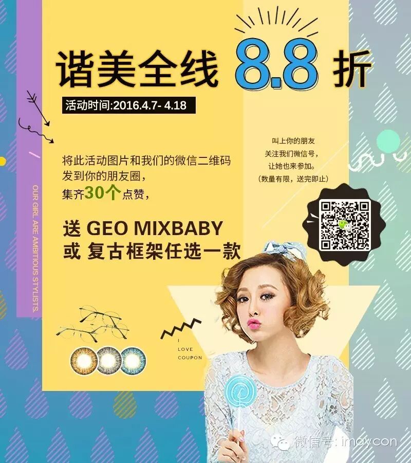 是的,图片你没看错,活动就是这样,具体如下 活动一: 谐美品牌全线8.8折, 老顾客可在老顾客价格上享受8.8折; 对啦~转发分享集赞的活动已经结束啦,赠送的美瞳和镜框已经被领完了。 谢谢宝宝们的参与, 没有活动奖品的宝宝也不要伤心, 建议可以继续关注我们的微博,微信,下来不定时会有活动; 活动时间:2016.4.7——2016.4.18;