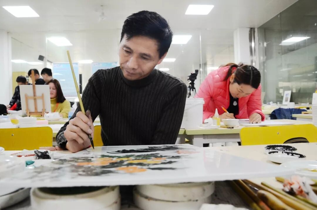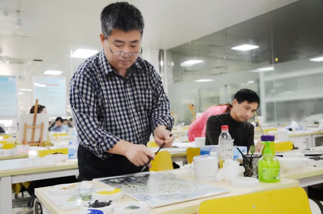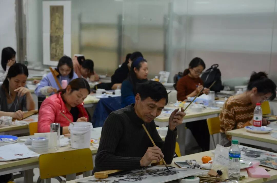 2018年11月29日下午南昌工学院传媒设计学院教师何曼婷于中华民族实训中心A-019带领着非遗传承培训人群开展了“作品设计与制作”--非遗传承人群研培计划瓷板画培训第十九讲第二期,并一同进行了手工教学活动。