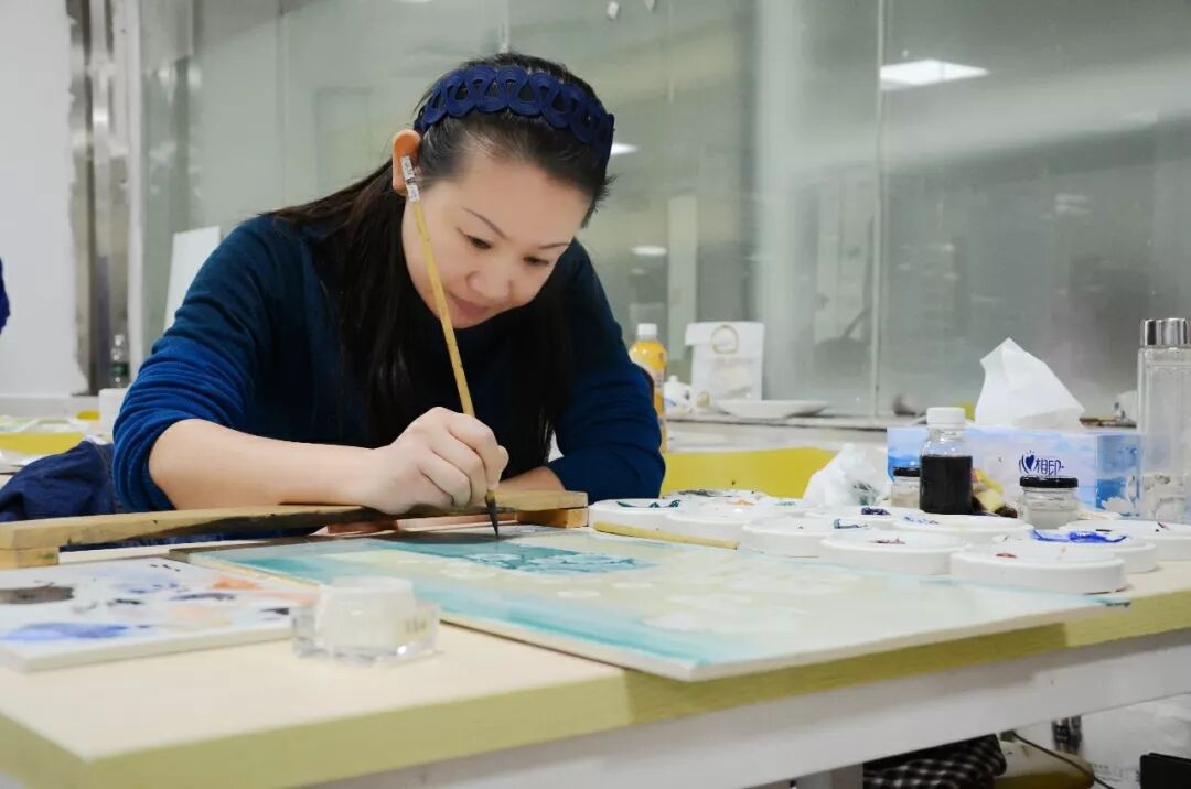 何曼婷带领学员们在瓷盘上进行描绘画,并对各位学员们进行现场指导,谈到了作画的一系列技巧:在工具的选择,不应仅仅局限在画笔上,刷子、刀片、海绵、毛巾等都是作者绘画的“笔”;在颜料的巧用上,学会巧妙地结合使用水料、油料、粉料;在手段的运用上,善用勾、染、点、擦、刷、拓、泼、洗、渍、撞、画、抹、刮、甩等特殊技法。