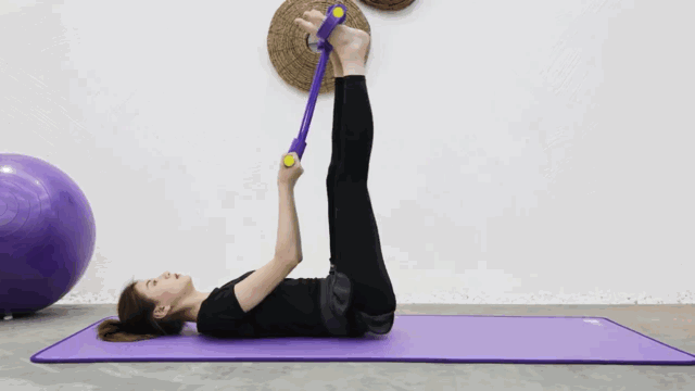 动作要领:这个腿部训练可以很好地帮助我们提臀瘦大腿,只需要我们运动下半身就可以了,上半身躺在瑜伽垫上保持不动,双手拉住拉力器,大腿克服拉力器的阻力进行上下运动,一天三组,一组20次。