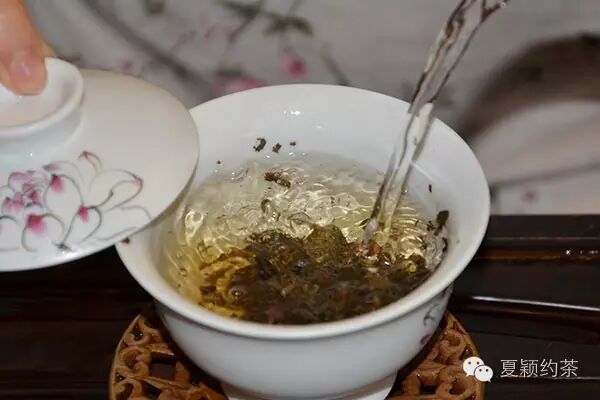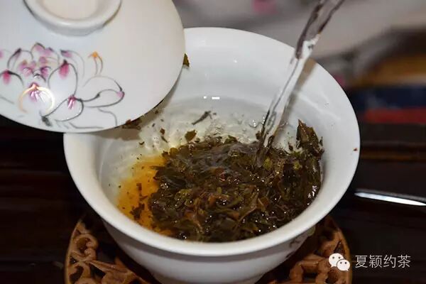 第二次注入沸水时,注意看盖碗的底部,茶中的丰富物质很快浸出,黄浓的汤色。