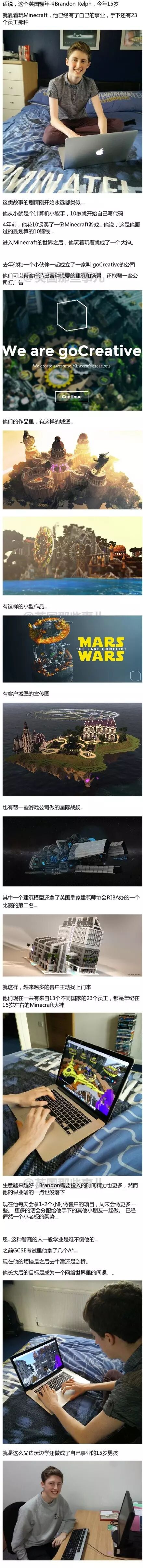 这个英国男孩只有15岁...... 靠着玩Minecraft玩出了自己的事业...现在才刚上高中呢.. 手下已经有23个员工了....