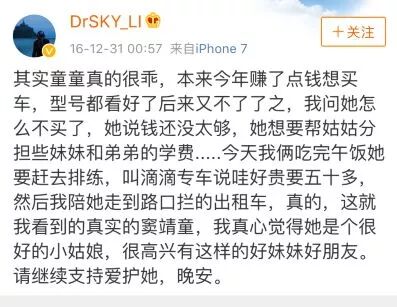 之前看到她朋友说她不问家长要钱,自己赚了点钱也想着贴补一下弟妹,打专车会嫌贵……