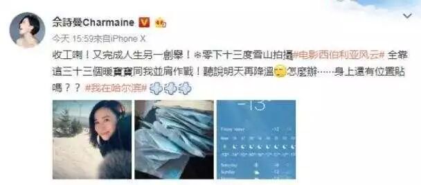 佘诗曼近日虽然就去了哈尔滨拍摄新片,但都不时在网上分享拍摄点滴。早前她还自爆不惜贴上33个暖包保暖,抵抗寒冷天气,看到一班粉丝都非常担心。