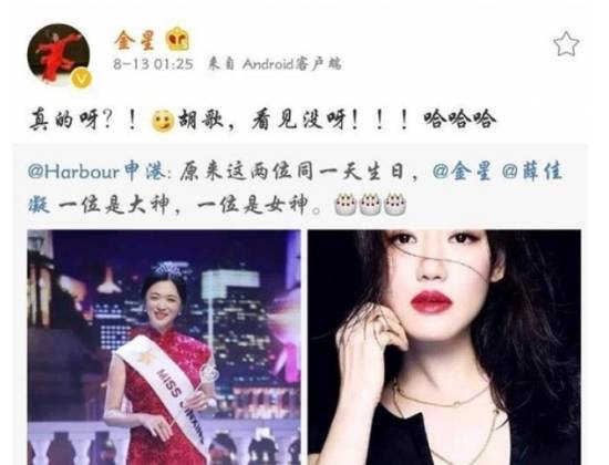 就连一向毒舌的金星主动为薛佳凝打call~。去年金星过生日,有网友说金星和薛佳凝是同一天的生日,金星便主动转发说:“胡歌,看见没呀!”