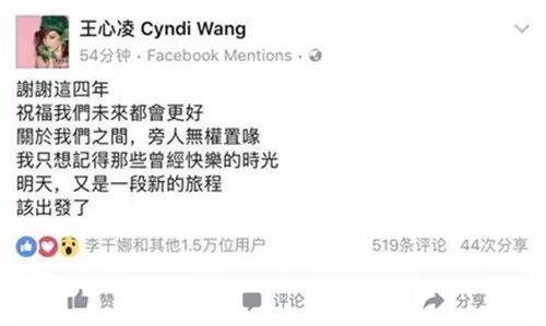 2月28日凌晨,王心凌在脸书首次回应了他和姚元浩的分手的消息,看来四年恋情确实结束了,人称为“渣男收割机”的心凌妹子本来这段恋情一度稳定,谁知还是以分手告终。