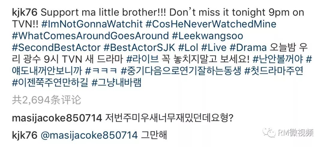 随后,光洙有在底下留言:“上周的熊孩子挺有趣的~哥~”