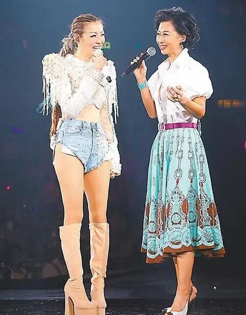 这个时候她是和郑秀文两个人在舞台上面唱歌,而且她身上穿的衣服其实挺好看的,上面穿的是一件白色的衣服,下面搭配的是一条蓝色的裙子,这条裙子看起来比较有民族风的气息,而且腰间还有一根紫色的腰带。