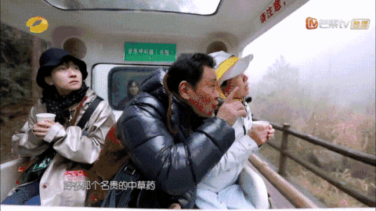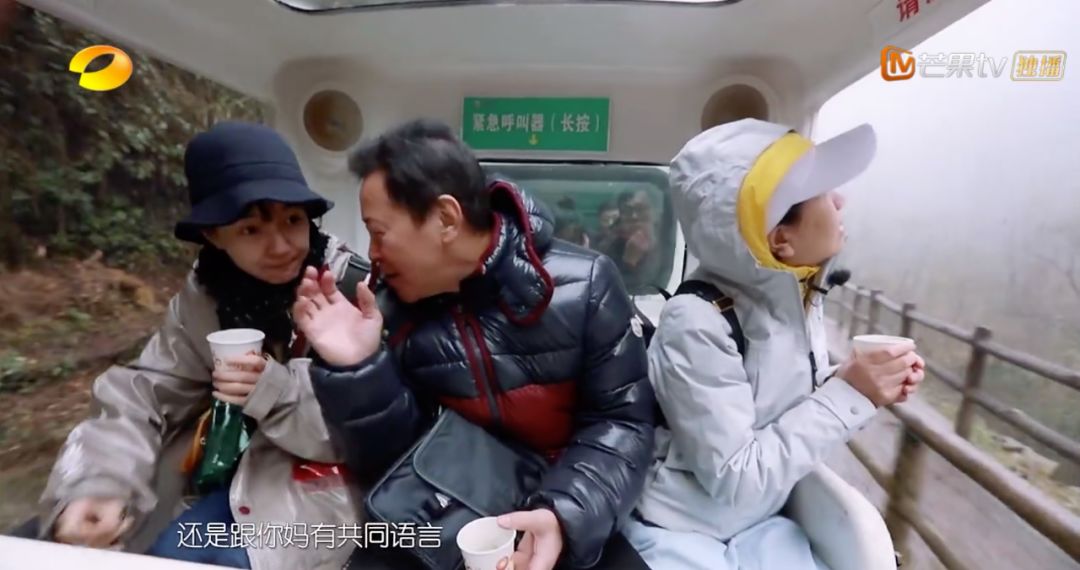 等三人坐上缆车欣赏沿途风景,焦爸爸就化身导游给老婆讲解山里有什么奇珍异草。