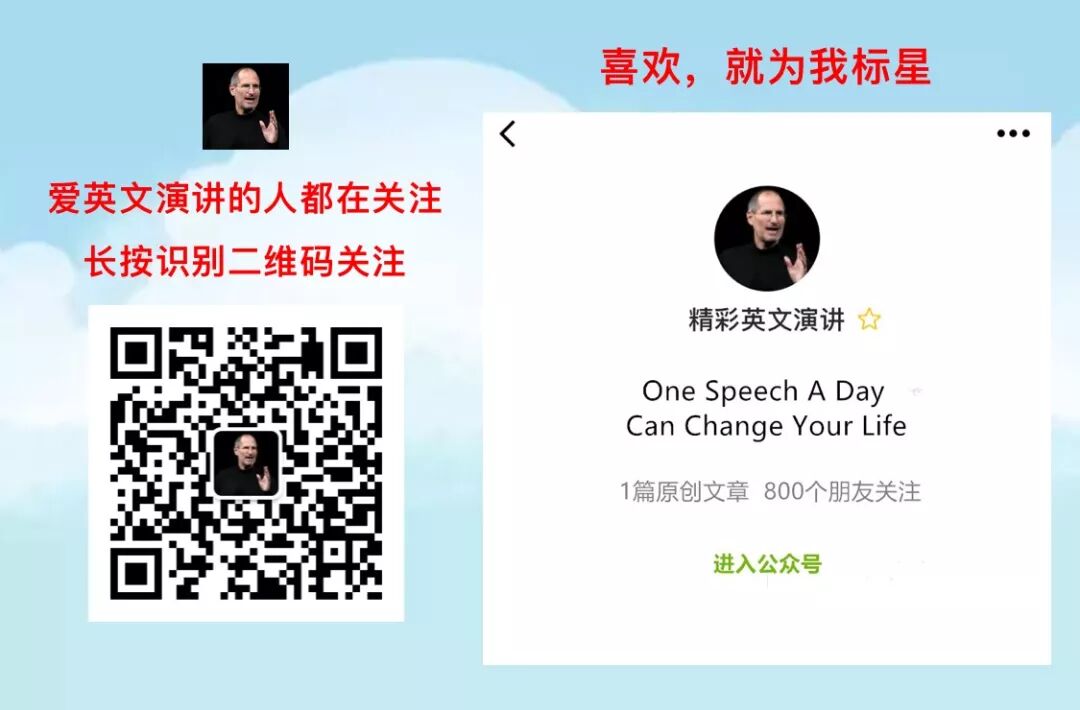 想第一时间接收英语演讲文章&视频?置顶精彩英语演讲就对了!操作办法就是:进入公众号——点击右上角的●●●——找到“置顶公众号”—— 开启。