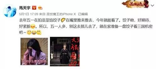 马天宇发博称,去年五一在韭菜馅饺子在嘴里推来推去,今年终于能看了。饺子吻好期待,好紧张。所以,五一人多,别这去那儿去了,就在家准备一盘饺子看三国机密吧。
