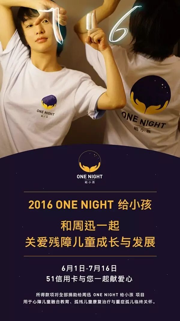 6月1日至7月16日,您通过51信用卡管家APP,每还款一笔,我们捐赠一元。款项将全部捐助给周迅“ONE NIGHT给小孩”项目,用于心障儿童融合教育、孤残儿童康复治疗与重症孤儿临终关怀。