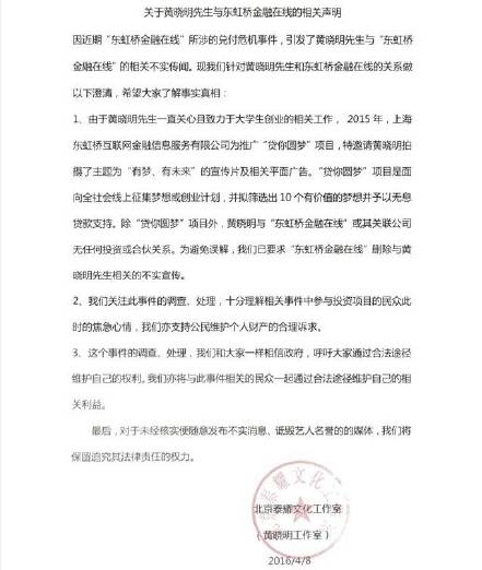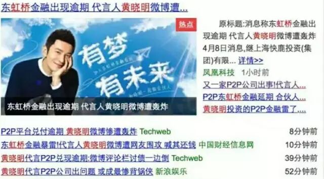 2016 年 4 月 7 日,黄晓明代言的“东虹桥”老板跑路,兑付无门。。。
