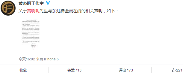 黄晓明带盐并担任合伙人的互联网金融平台“东虹桥金融在线”确认延期兑付,拿不出钱给投资者了,老板跑路了。