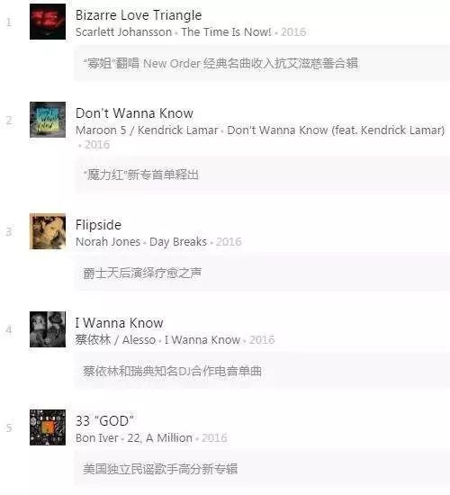 蔡依林与瑞典知名 DJ Alesso 首度合作《I Wanna Know》、人气团体 OneRepublic 与朋克乐队“绿日”相继推出全新专辑、“魔力红”新专首单释出、大热美剧《怪奇物语》原声组合再发新作、寡姐 Scarlett Johansson 翻唱 New Order 经典名曲 “Bizarre Love Triangle” 、 卢冠廷八年后再踏“红馆”唱起“一生所爱” ……