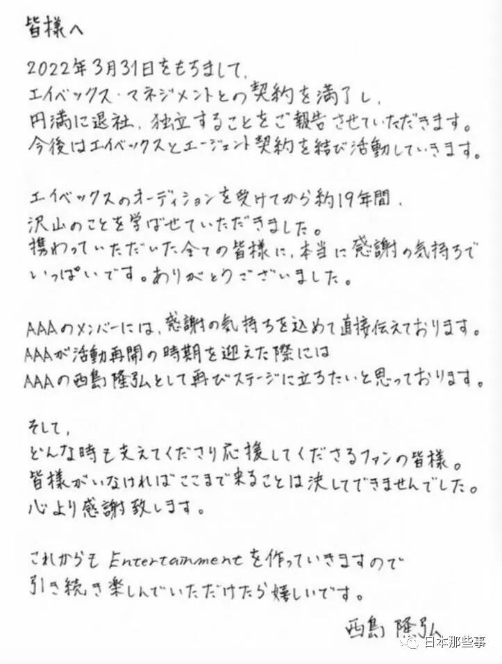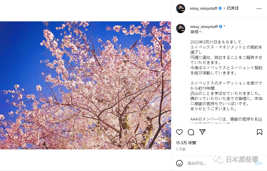 Nissy在ins上传了一张樱花的照片,并且手写了信件,表示非常感谢AAA的成员,等到AAA恢复活动的时候,想以AAA西岛隆弘的身份重返舞台。