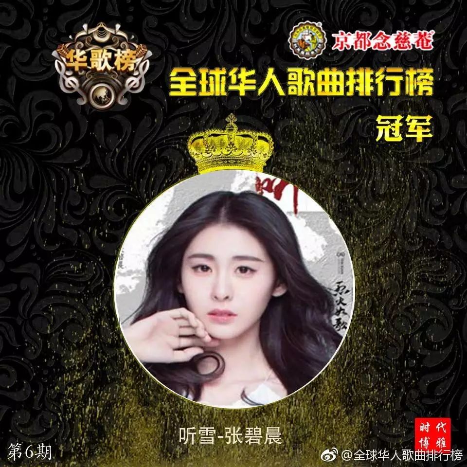 ▲在第六期全球华人歌曲排行榜中,张碧晨的《听雪》获得了第一名。而亚军和季军分别是张杰和徐佳莹。