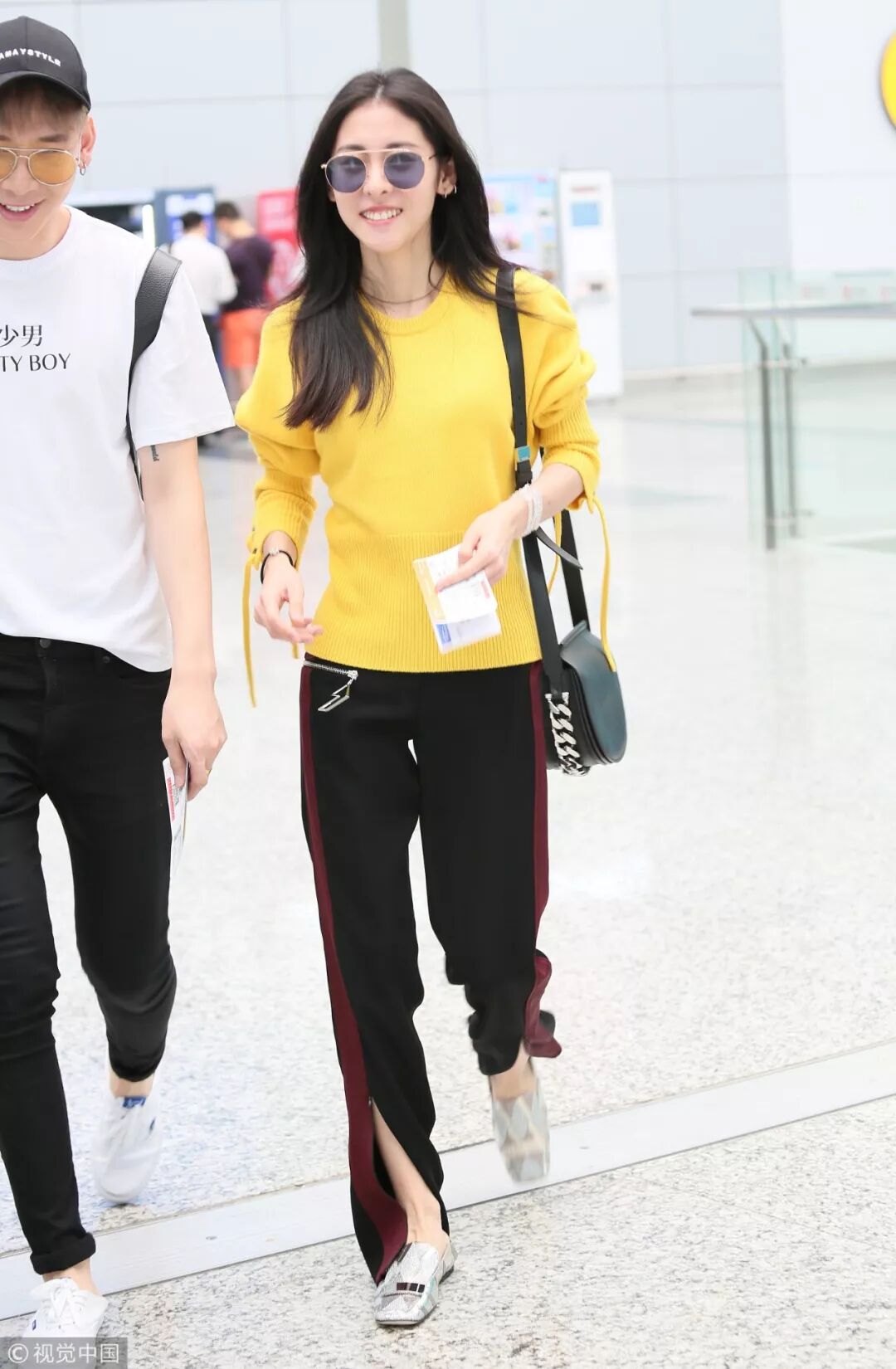 ▲身穿Neil Barrett黄色袖子绑带长袖上衣,肩背Givenchy Infinity黑色马鞍包,下穿Versus Versace黑色侧条纹开叉休闲裤,脚穿Sergio Rossi金属色银色平底鞋拖,轻松抓眼球。