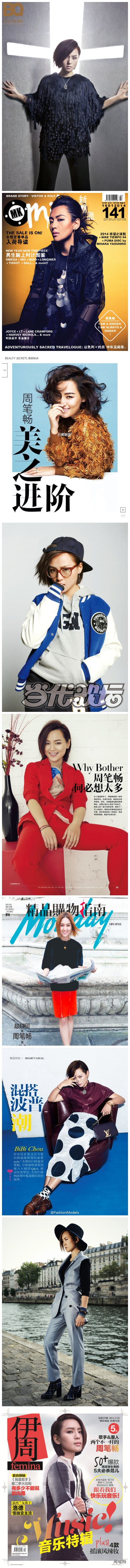 周笔畅今年先后登上VOGUE|时尚COSMO|时装|伊周|精品|MILK|BQ|当代歌坛等多本杂志封面。2014周老板最大变化是摘掉大家熟悉的眼镜,在时尚方面尝试更多可能性。