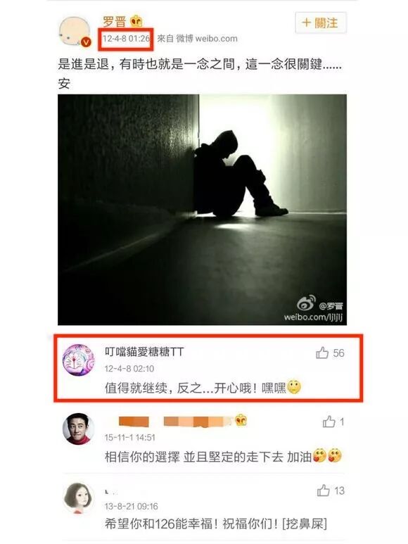 12年4月8日,罗晋在1:26分(12月6日是唐嫣生日)发微博,纠结是进还是退,唐嫣助理在评论区鼓励▼▼▼